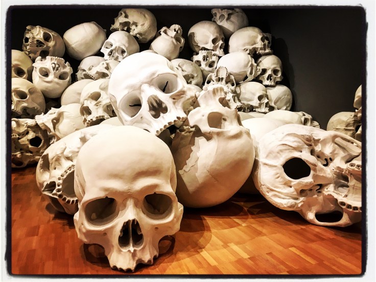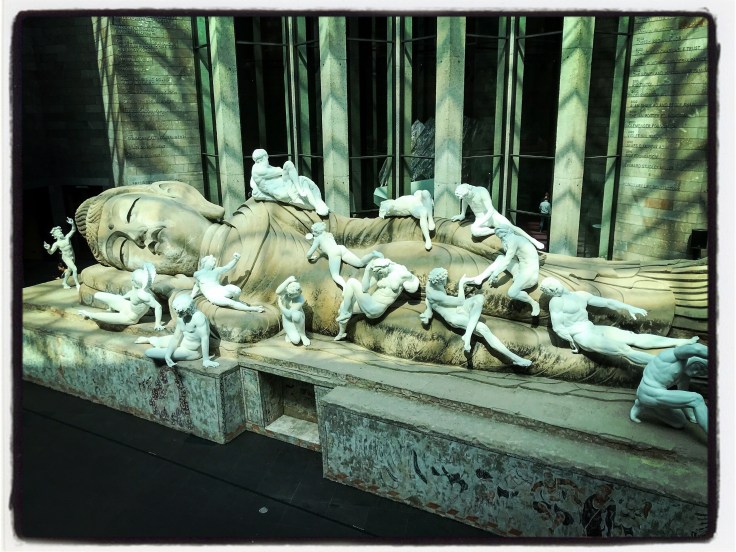 I spent a little over an hour in the main art museum, which was quite interesting with it’s classical, modern and just downright whacky ‘stuff’ all shoved into one beautiful eclectic yet modern building. Greeted by a massive Water Wall (photo below) and then the Buddha being climbed upon by Roman classical figures (photo below). I spent some time with Rodin, Mattise, Renoir, only one Monet, no Lautrecs, and then Warhol before entering the video den. That’s where it got a little whacky.