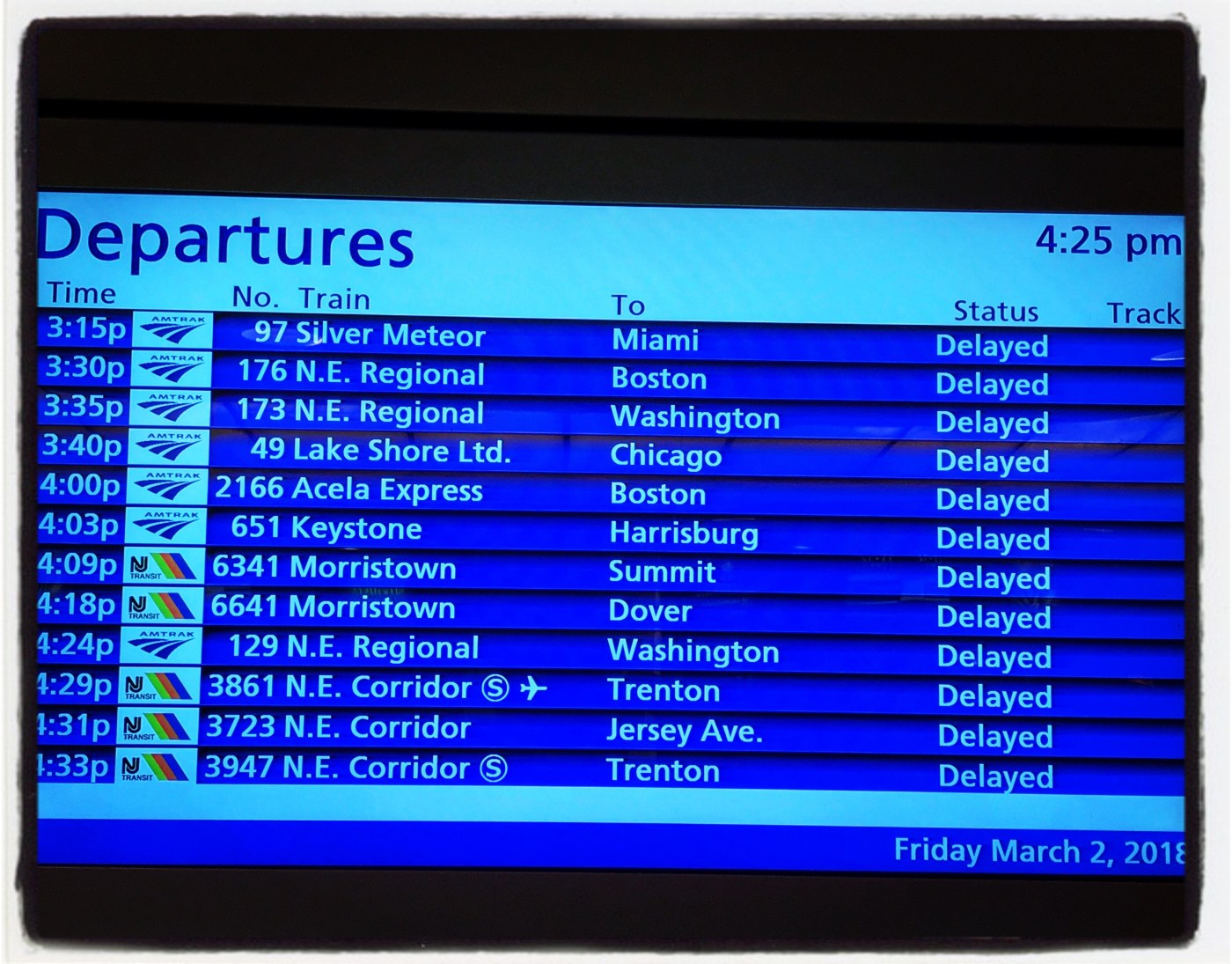 I leave the group at Rockefeller Center at 12:30, lug my massive bag (not going to be home for 2.5 weeks) onto the subway, which is a task itself, walk the final 1/2 mile to Penn Station knowing my train is already 15 min delayed (according to the Amtrak app). Nope, all trains delayed. Indefinitely.