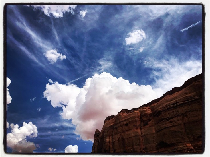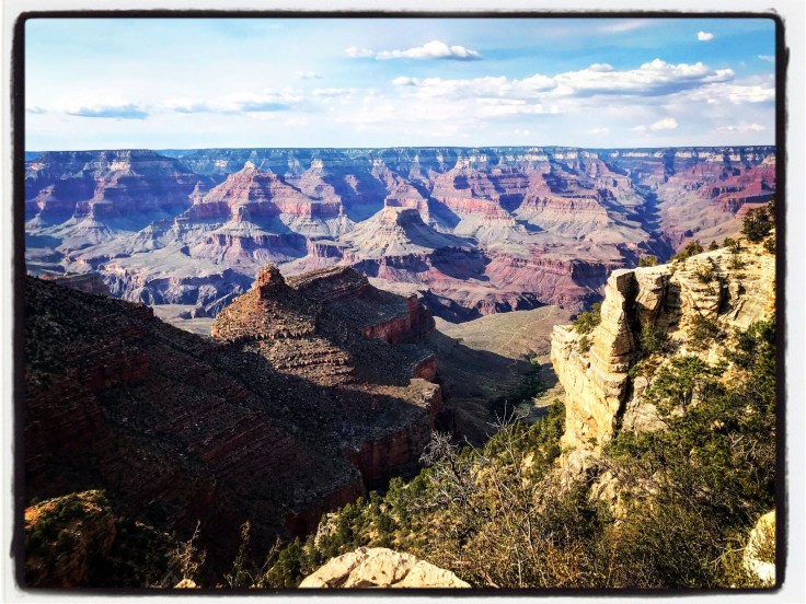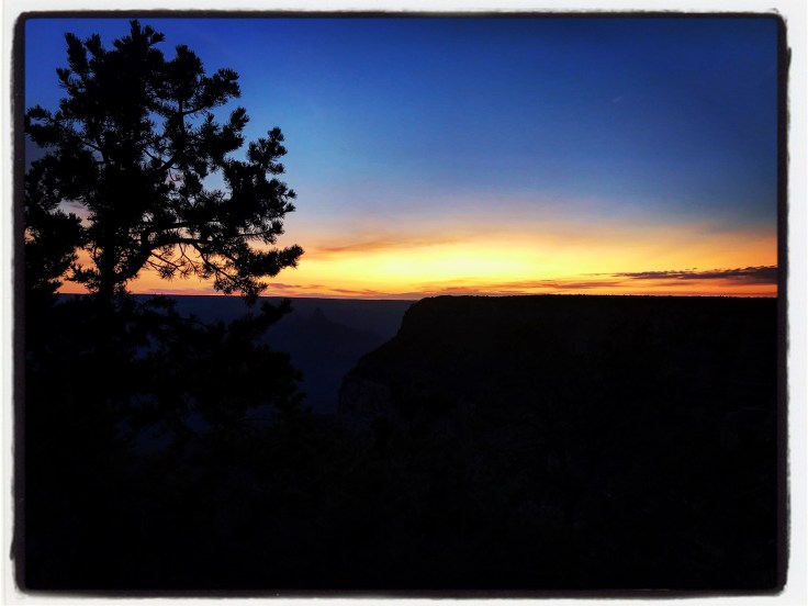 Every time I’m here I noticed something different. The sky has different clouds, or none at all. The 50 Shades of Red radiating from the rocks change by the minute with the passing sun. The sound of the trees being lightly jostled as the storm moves in. Or, more likely, it is the feral pack of child creatures screaming into the Canyon hoping to wake the fucking dead before their parents discover they have broken free of their ice cream store tethers and are wildly running amuck along the south rim in a Walking Dead scene study. Grandma, their fearless guardian, is leaning against the ice cream shop window. Asleep.