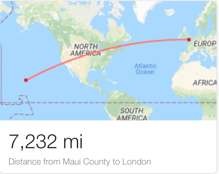 3 flights: OGG-LAX-IAD-LHR. 7,232 miles.