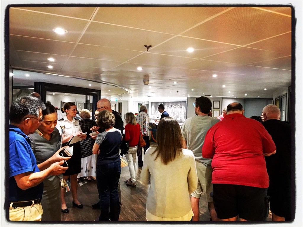 To set the tone: I’m at my office space on Deck 3, drinking my iced tea, minding my own business, listening to the ship’s musical director play the piano in the room behind me, when this random and unfamiliar guy and his wife stopped at the ship’s map. Since I was one of the few people sitting nearby, he chose to mouth off to me about how he bet they were never going to get home any time soon, and how Holland America was ‘greedy’ and only wanted money so that is why they stopped in Hong Kong. Greed. (Insert a photo of Liz turning red with a slow boil) “…they are going to have SO many civil lawsuits against them! They won’t know what to do!” says the pissy little man, with his crunch-faced wife behind him, to me from across the room. And, this is where Liz looses her shit…. “Are you saying that YOU are the one planning to file a civil suit? Why? Because you didn’t get to see a temple in Naha, Japan? And you got another free cruise out of it?” There were a few other choice words spoken between us, his wife started wagging her finger at me, which, for those of you who know me, never ends well for the wagger, but they were relentless. He just kept repeating the word ‘greedy’. Luckily, Judy, showed up toward the end of it, she literally walked right into it, and they started to calm down. Funny, how they blamed Holland America for being so ‘greedy’ and then argued with me about how they were going to F-ING SUE! What are you going to get out of the lawsuit, huh? Your entire cruise refunded? Already done, asshat!