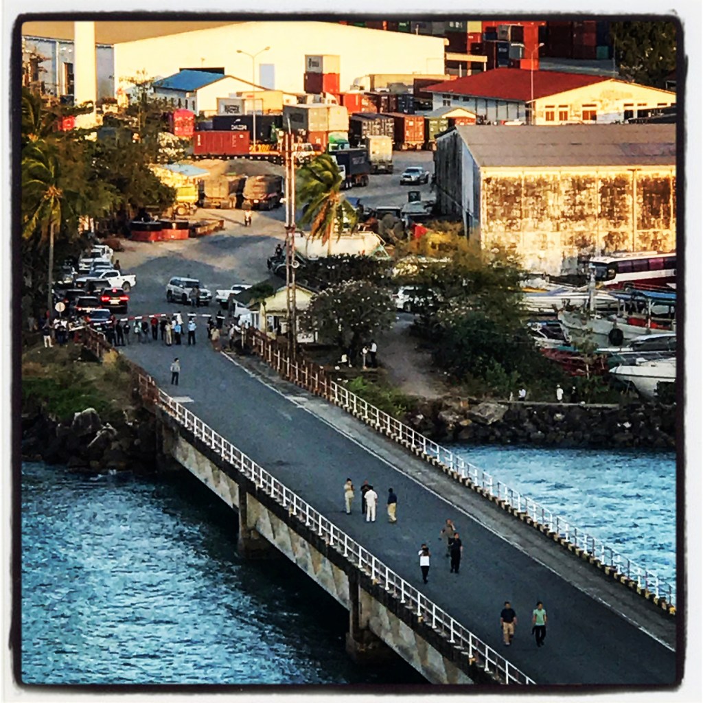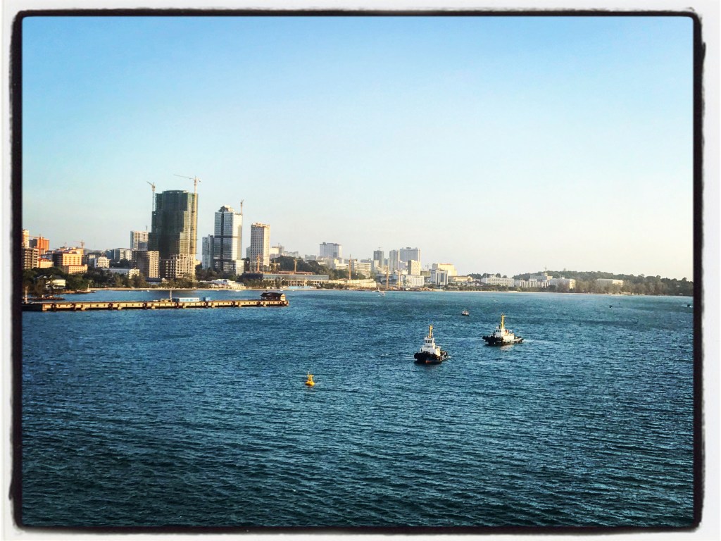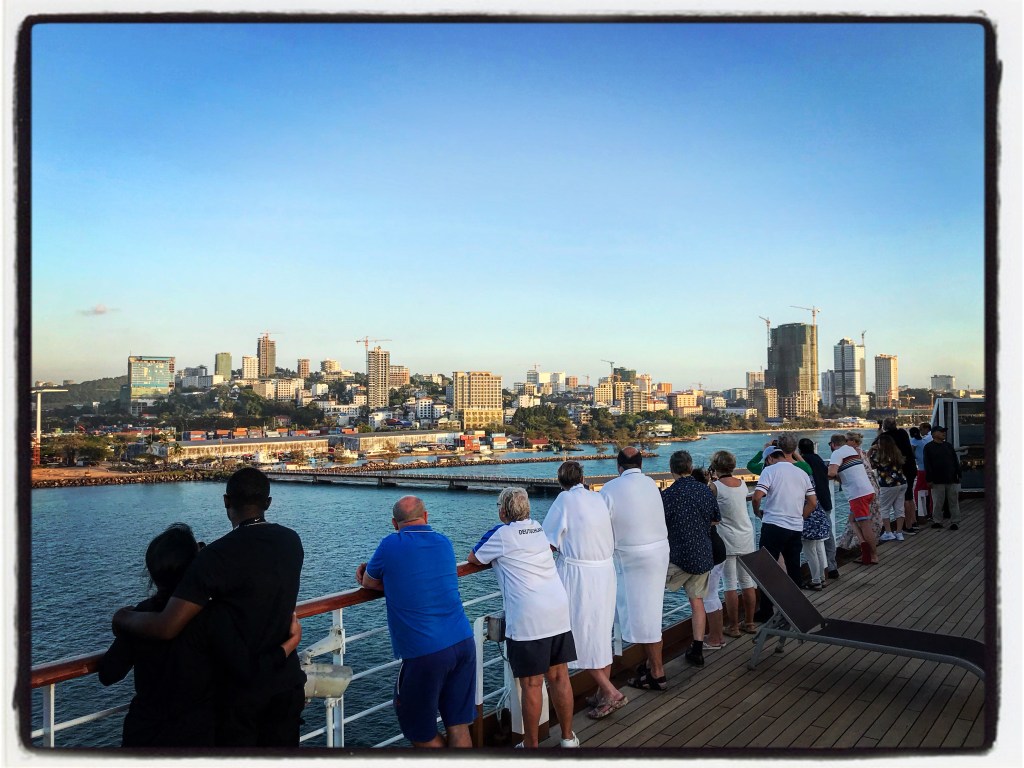 But first, anchor in the bay, have immigration and health officials come on board, 20 people swabbed for the virus, visas glued into passports, and we wait. And wait. We are professionals at waiting. Ok, done, now the ship can move to the dock. The Captain makes his announcement, anchor up and away we go! Everyone is outside on the decks watching. Excitement and HOPE is in the air, along with a lot of smoke from nearby burning trash.