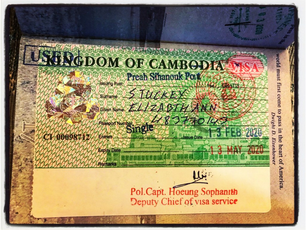 Cambodian officials come onboard the ship and begin the clearance procedures, which is quite lengthy. We did not get cleared until very late last night, which really messed up the ship’s intention of getting passengers out on late flights. Apparently, they had to fly our 20 health samples to Vietnam to be tested and wait for the result. We are still coronavirus-free.