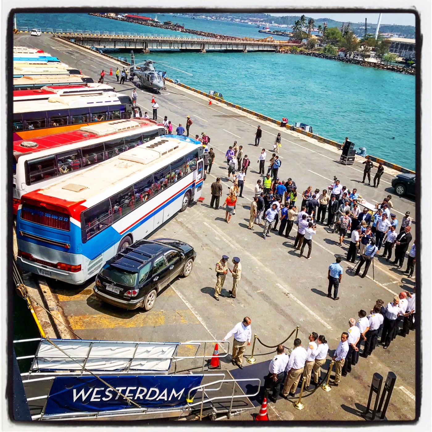 I grabbed my little lunch bag for the road, gave my girls from Guest Services a hug and headed down the gangway. The Captain and his officers were shaking everyone’s hand, the Cambodian media was there, Cambodian government officials, embassy staff, and a little mayhem thrown into the mix. The Captain gave me a huge hug and thanked me for all the encouragement I’d thrown his way, which nearly made me cry. He is such a great guy thrown into an impossible situation while trying to keep an entire ship safe. Not an easy job. He is already my hero of the year.