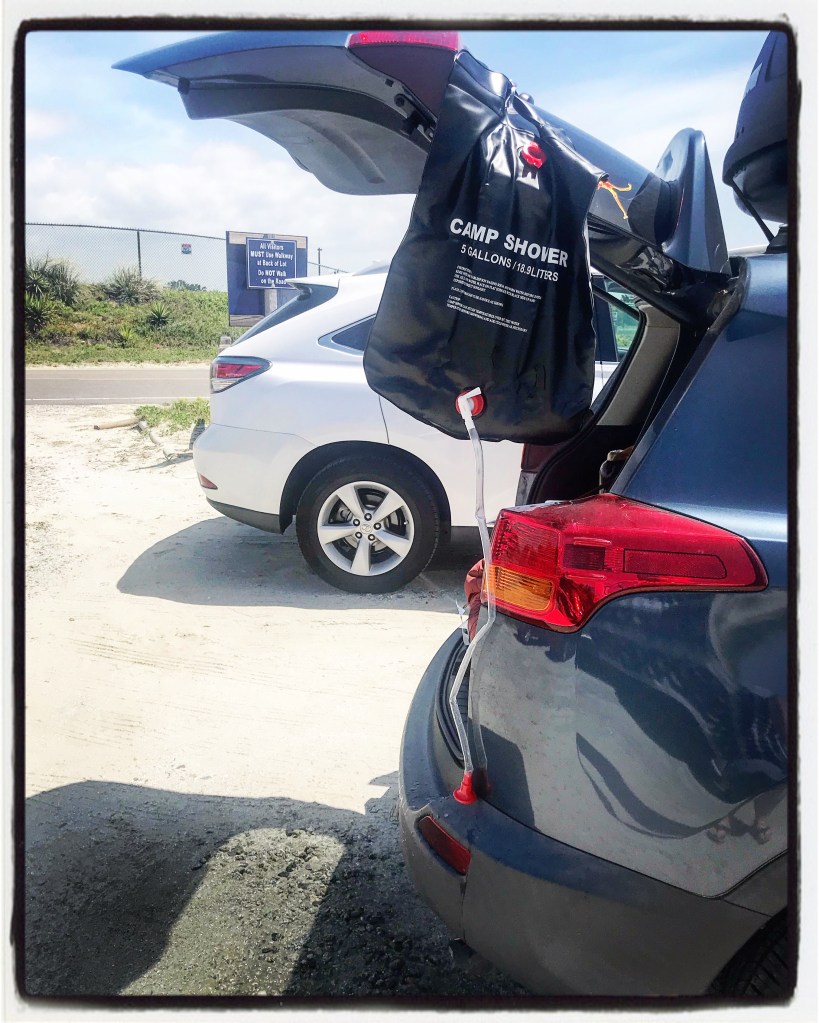 I decided to take a shower in the parking lot. Yep, you heard me. A shower in a beach parking lot. People look at me like I’m an alien while wearing a face mask down here in the South, but taking a home-made parking lot shower doesn’t get a second glance. All you need is a strong suction cup attached to the back window, your solar shower, and you in a bathing suit so an arrest can be avoided.