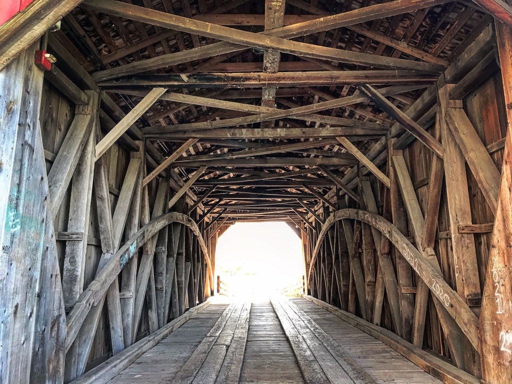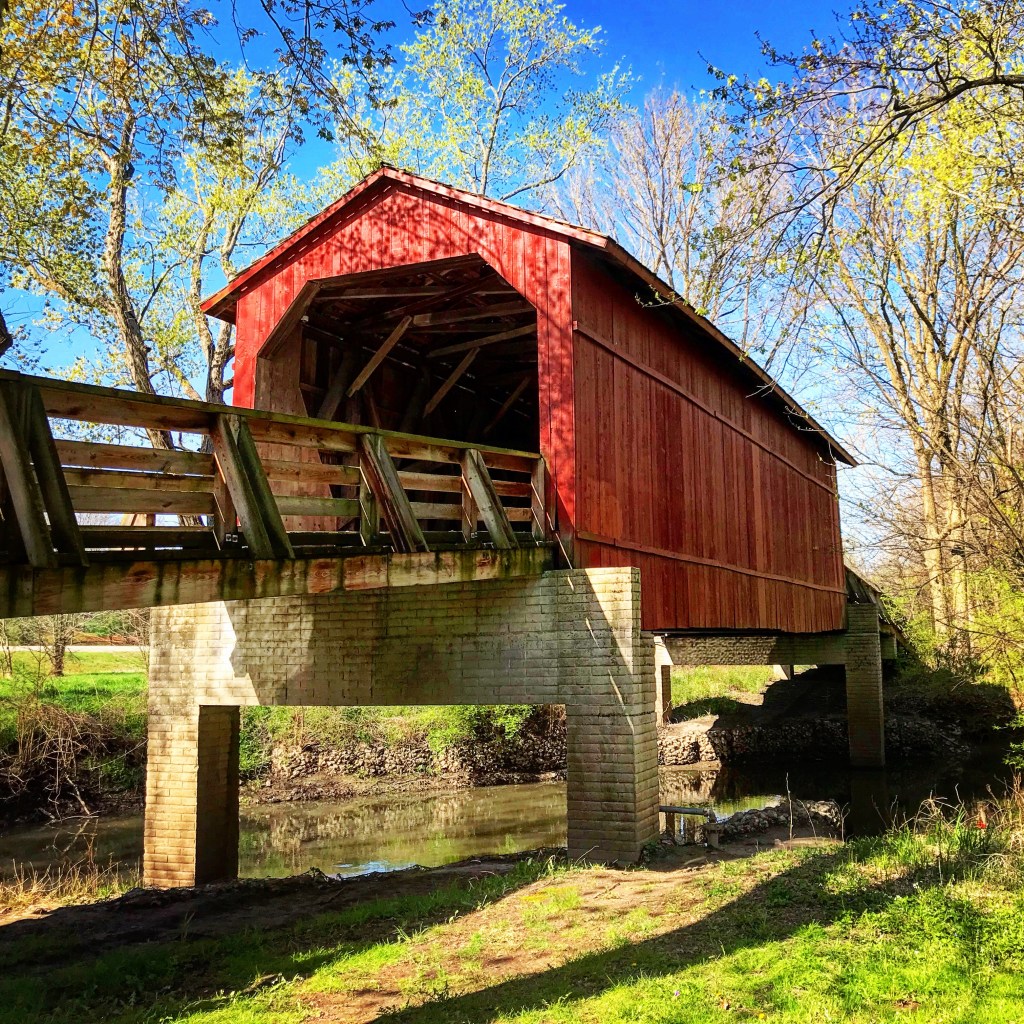 This is the Sugar Creek Covered Bridge. Look out, Vermont. This one is gorgeous. Built in 1880 using the Burr Arch wooden truss design with triangle-shaped supports. She’s 110 feet long. The babbling brook really makes you have to pee after your second coffee of the morning. Brutal, but beautiful stop.
