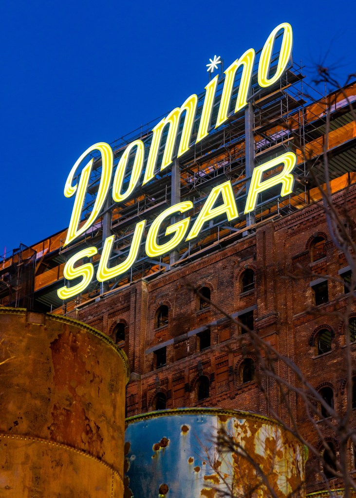 A replica of the 40-foot Domino Sugar sign was installed and fully illuminated this week atop Williamsburg’s Domino Sugar Refinery building, which was part of a massive sugar factory that operated from the 1880s to the early 2000s.