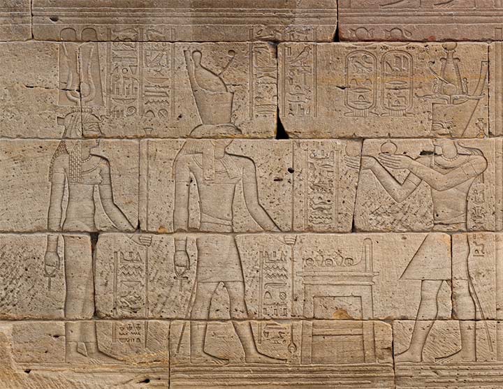 Reliefs: As is common in Egyptian relief decoration, the outside of the temple was carved in sunk relief, which created deep shadows in the bright sunlight. Raised relief, when the background is carved away and the figures are raised, was used for the interior.