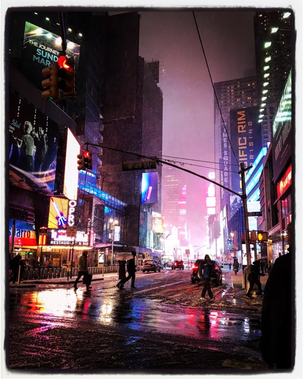 March 7, 2018 Sloppy, wet, puddles, wind, closed, slip, chill, people, fall, subways, potholes, ice, snowflakes, mud, slush, misery, fluster, bluster, broken. Done.